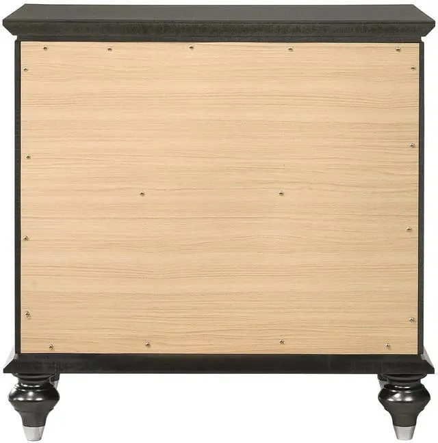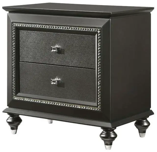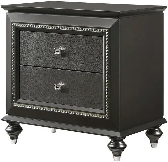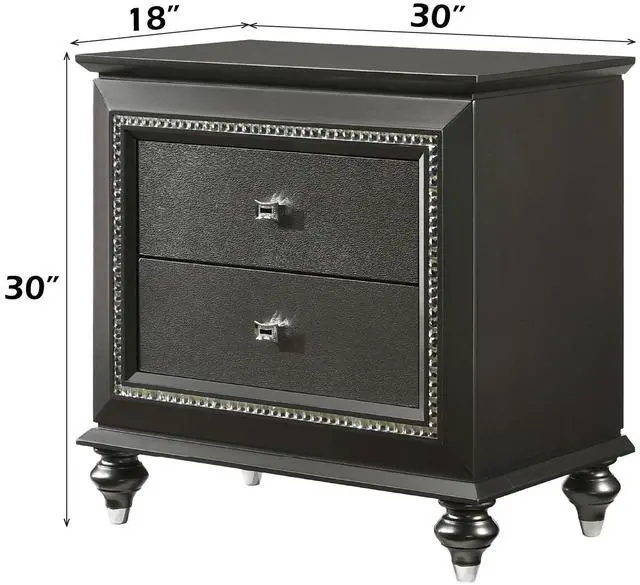 Elegant Design: Nightstand with a wooden frame featuring crystal-like sparkling trim, embossed textures, and classic wood bun-turned legs for a sophisticated look.