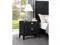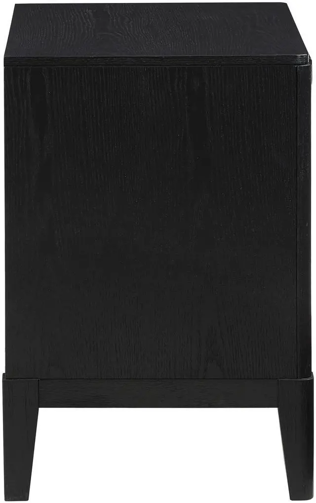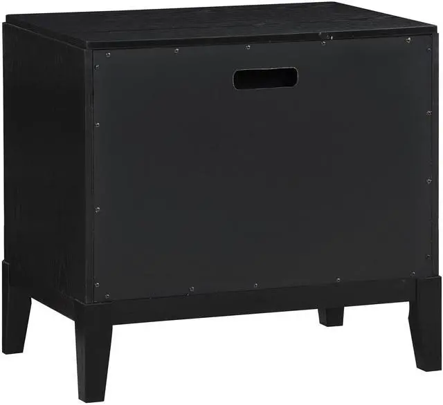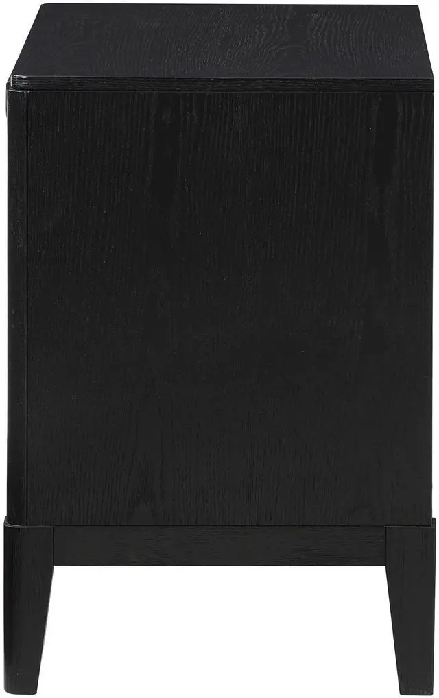 This contemporary wood nightstand showcases a sleek wire-brushed black finish, adding bold style to any bedroom