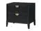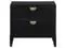 Demi-lune metal handles in a warm golden tone offer a striking contrast against the black finish, enhancing the nightstand's chic appeal