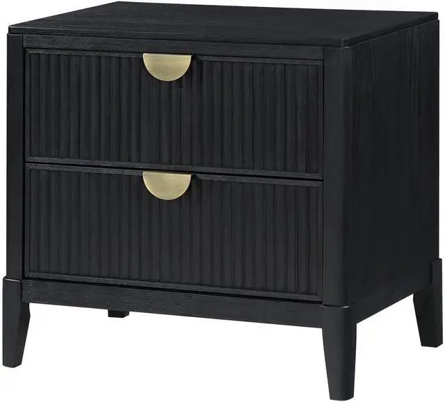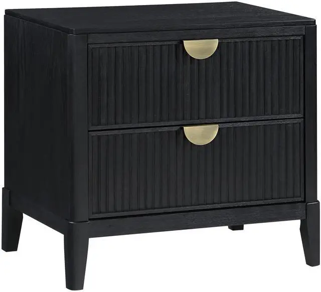 This contemporary wood nightstand features a sleek wire-brushed black finish and fluted-textured drawer fronts, adding bold style and sophistication to any bedroom. Warm golden demi-lune metal handles and a black felt-lined top drawer for delicate items combine practicality with chic, modern elegance.