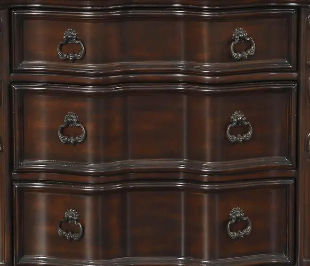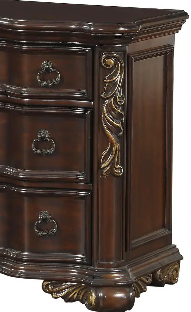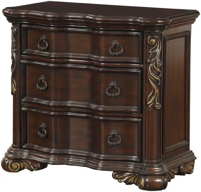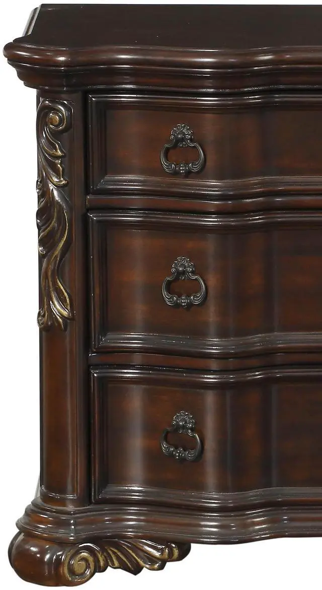 Grandly styled for the traditional home is this royal Collection. The substantial wood framing of the nightstand creates a distinct serpentine profile that carries into the design of the case pieces. Brown faux leather provides complementing contrast to the rich cherry finish. Traditional cherry and birch veneers accenting furthers the elegant presentation of the Royal Highlands Collection. Product Dimensions:- Overall Dimension: 36" x 19" x 31.75"H Drawer interior: 25.75" x 14.5" x 6" (1); 25.75" x 14.5" x 8.25" (2) Listing Includes :- One Nightstand Only. Simple Assembly Required.