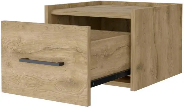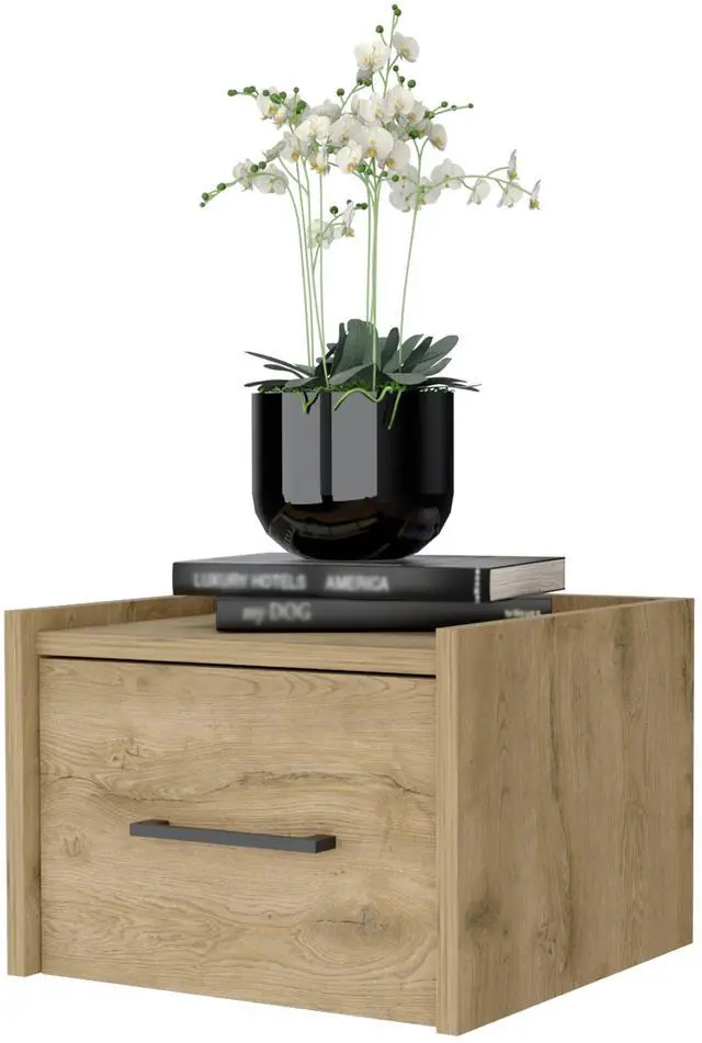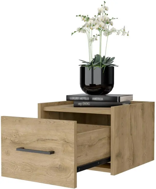 Elevate your bedroom ambiance with the floating nightstand, designed to maximize space with its wall-mounted construction, featuring a streamlined single drawer for essentials and a generous top shelf for display. Whether it's your favorite book, a charging station, or decor, the spacious top surface stands ready to accommodate.
