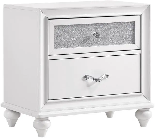 Featuring a crisp white finish, this piece brings a clean and timeless look that complements any décor style with ease. Equipped with two spacious drawers and faceted crystal hardware, it offers elegant storage and a sophisticated, modern design with its sleek rectangular shape.