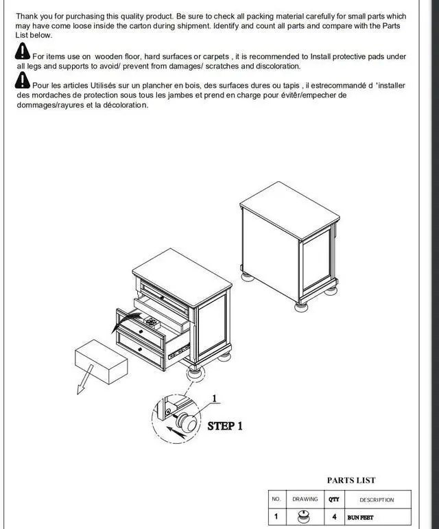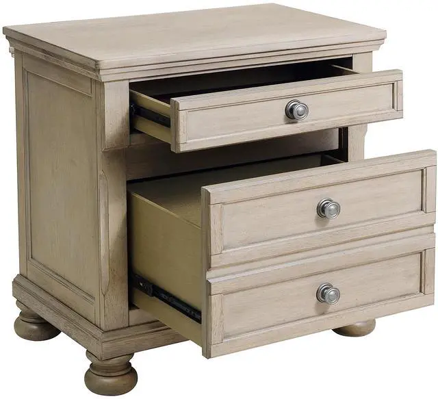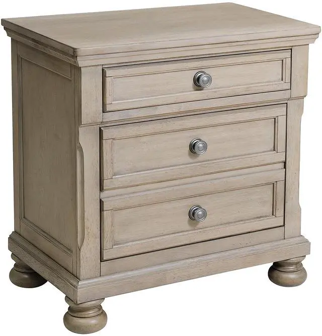 Traditional accents, such as turned bun feet support the nightstand, and a gray, lightly wire-brushed finish on birch veneer and selected hardwoods, blends with framing and lines that complement your personal style. Hidden drawer storage in the nightstand is a clever way to hide your valuables. Product Dimensions:- Overall Dimension: 28.25" x 17.75" x 29.5"H Drawer interior: 21.6" x 13" x 9" (1); 21.7 x 14.8" x 14" (1); hidden 21.7" x 14.8" x 4.3" (1) Listing Includes :- One Nightstand Only.