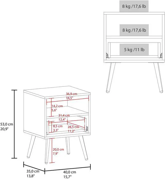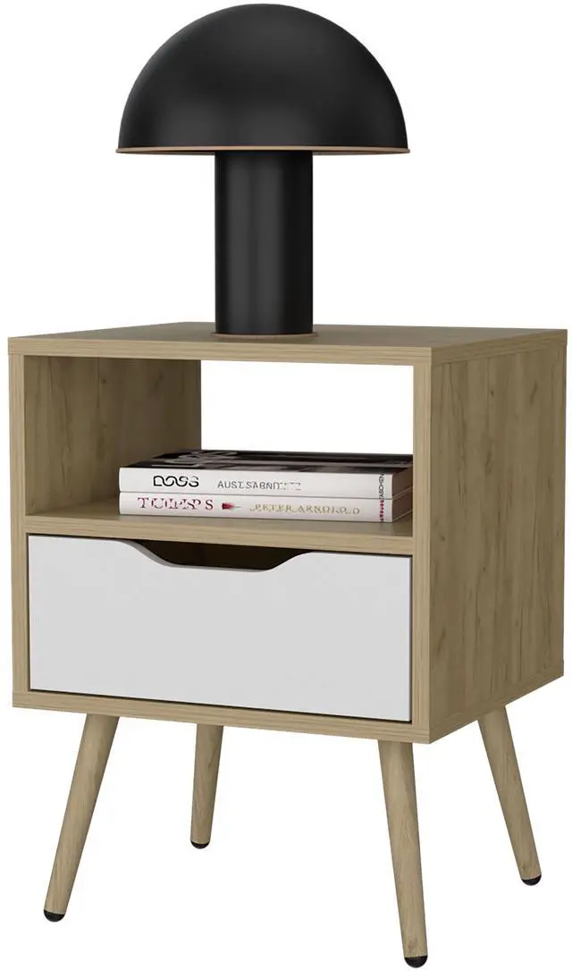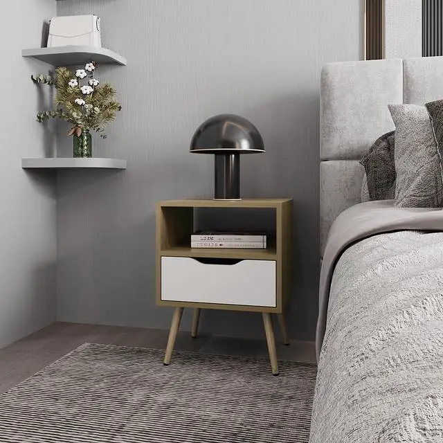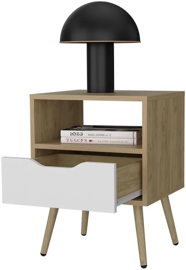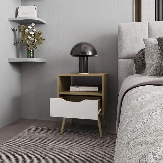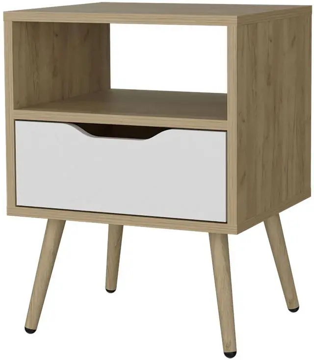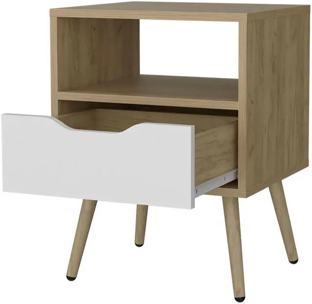Combining functionality and modern aesthetics, this nightstand features a sleek Scandinavian-inspired design. It includes a spacious open shelf for easy access to books or essentials and a smooth-gliding drawer with a stylish cut-out handle for discreet storage. Supported by sturdy angled legs, its wood finish adds warmth to any bedroom decor. Perfect for enhancing organization and style in contemporary spaces.