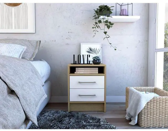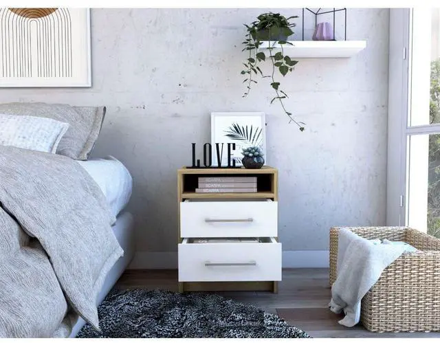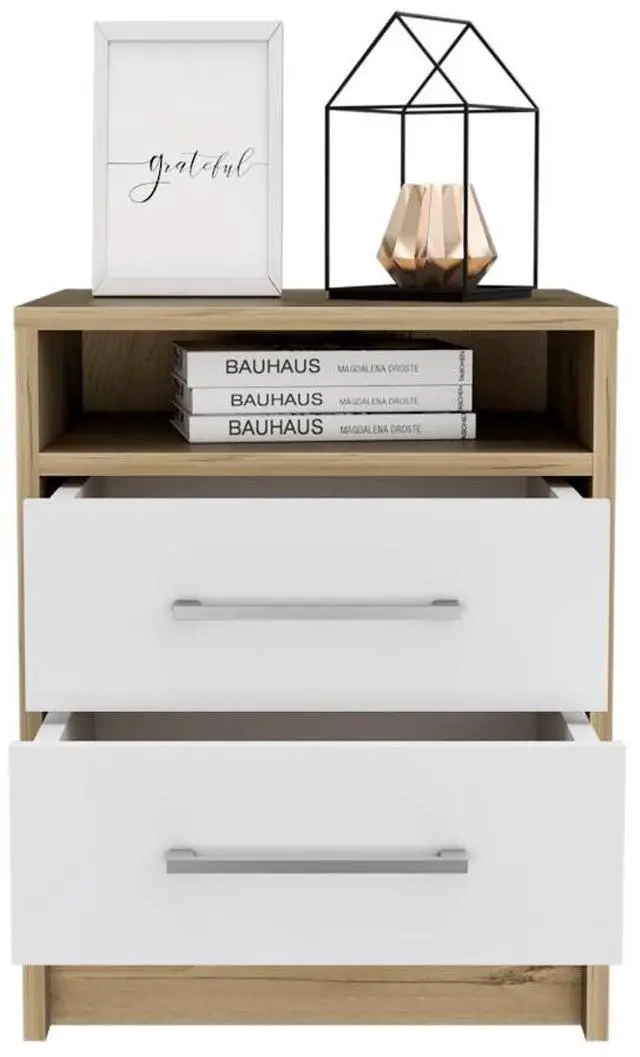 Nightstand 20"H, Two Drawers, Superior Top, Metal Handles, White / Light Oak