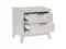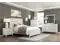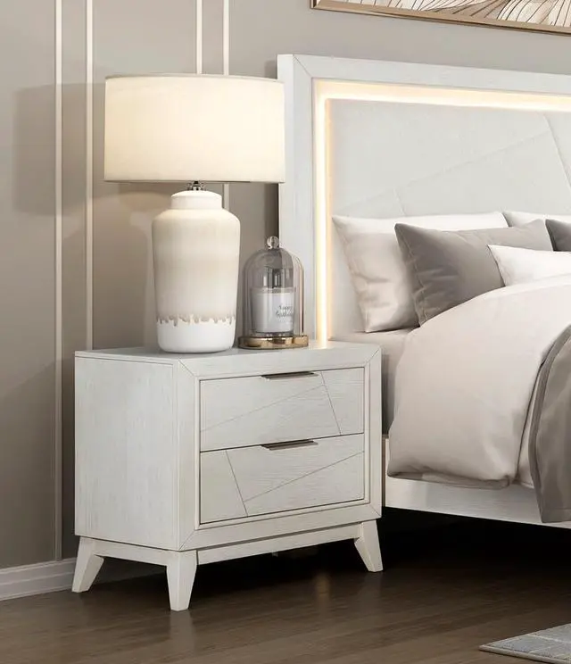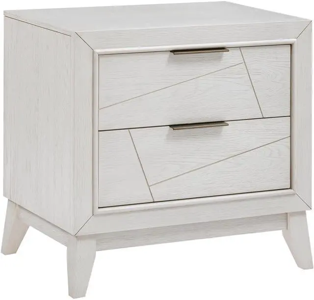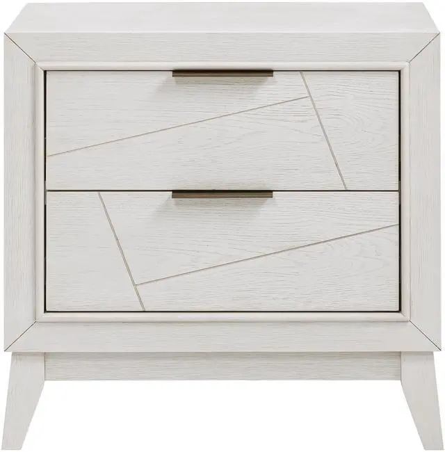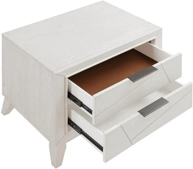 Bold geometrical styling is paired with unfettered modern lines to create the unique design of the Asteria Collection. An antique white finish highlights the collections oak veneer. Flat black finished metal bar hardware fronts the drawers of the nightstand. Asymmetrical routing fronts the drawer faces for dramatic accent to the collection.