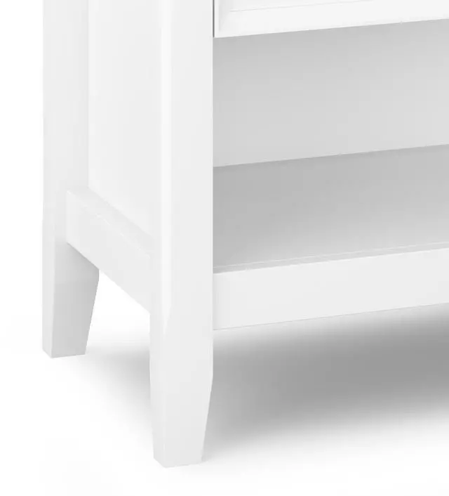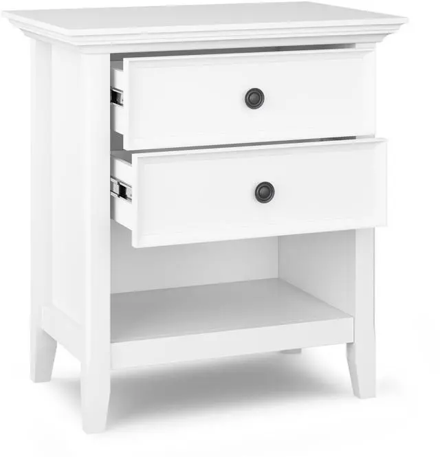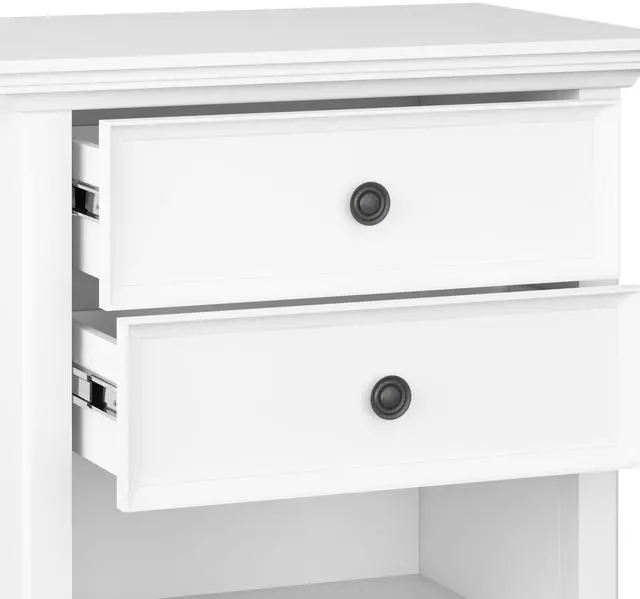 Features two (2) spacious drawers with metal drawer glides and open bottom storage area
