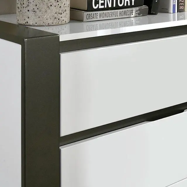 Product Description:- Just one look, and there is no doubt where this night stand belongs--in a modern home. For starters, a striking two-tone design is produced by allowing large blocks of high gloss white to be interrupted by dark, metallic gray gaps. The panels all feature this bold color contrast. True to modern pieces, drawer handles are out of sight, as the gaps serve as concealed pulls as well. Look closer, and you'll notice how the gaps themselves are not even in width; this purposeful asymmetry adds more to the appeal and modern vibe