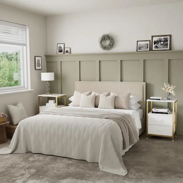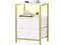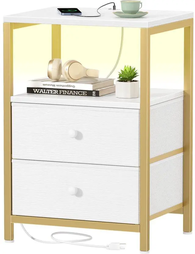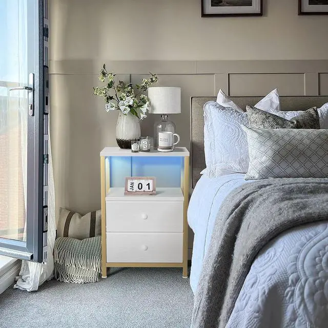 The top is wood, metal frame, the drawer is made of fabric, the front of drawer is leather material