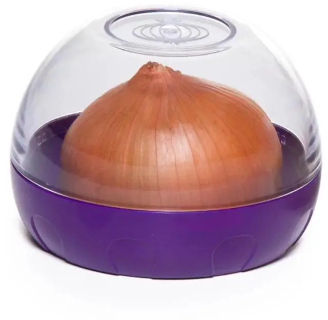 Keep onions fresh for longer with this Progressive Prepworks onion keeper. Made of ABS and SAN, this saver features a purple base and clear lid that allows for easy identification of the contents inside. This onion keeper allows for convenient storage of half-cut or diced onions and stops that strong, onion smell from filling your fridge. Just turn the onion keeper upside-down to store diced or sliced onions. Dishwasher safe, this onion keeper makes clean up a breeze.