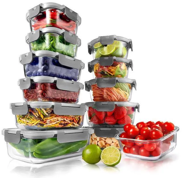 The NutriChef NCGLGY 24-Piece Superior Glass Food Storage Containers Set is a convenient and durable solution for keeping your food fresh and organized. Made from high-quality, durable borosilicate glass, these containers are resistant to stains, odors, and warping under extreme temperature changes. The containers are designed with a 100% leak-proof airtight seal, ensuring that your food stays fresh for longer. The innovative hinged locking lids are BPA-free and feature a snap-tight seal to prevent leaks. This set includes 12 containers of various sizes, perfect for meal prep, storing leftovers, or keeping food fresh on-the-go.