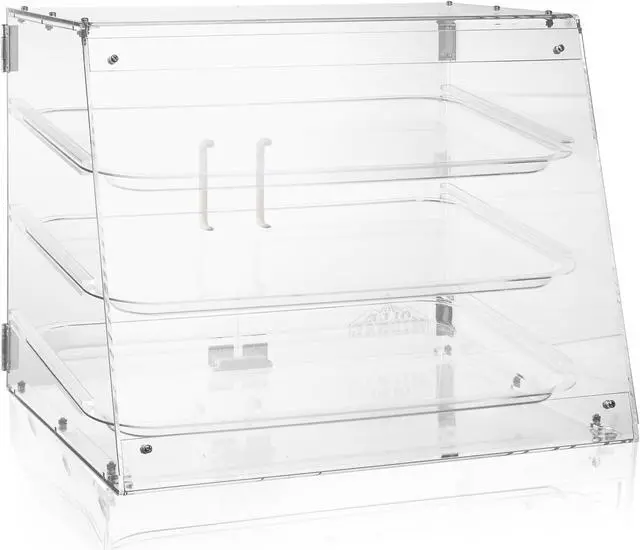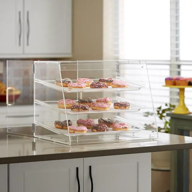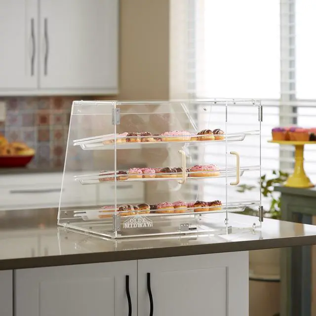 Olde Midway's bakery display case features three tiers with removable trays. It is an excellent option for showcasing baked goods in various retail establishments. This pastry display case is designed with a transparent acrylic material, allowing customers to see the goods on display and making them more likely to purchase something. In donut shops, cafes, convenience stores, and other businesses, a bakery display case is essential to attract customers and increase sales.