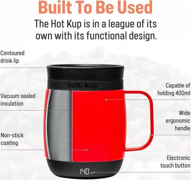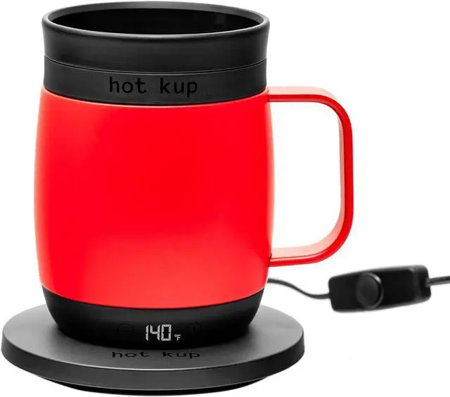 Hot Kup - From Ice to Boil Temperature Controlled Mug in Red. The Hot Kup in Red is temperature control mug that goes from ice to boil very quickly. You can set the temperature with touch buttons on the Kup or with your smart phone App. You can preset your brewing options for coffee, tea, hot chocolate, and more. The Kup has a nonstick coating to help prevent sticking and is made with a stainless steel double wall and vacuum insulation. This Kup is environmentally friendly and can be used multiple times.