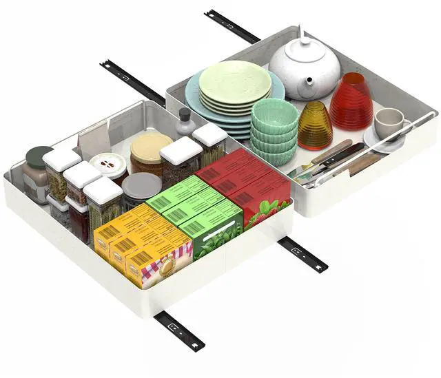 Easy Installation: Our kitchen cabinet drawers utilize strong adhesive tape on the bottom for fixation, no tools, no screws, or drilling. Simply peel off the film and stick the drawer in the cabinet you need within 1 minute.