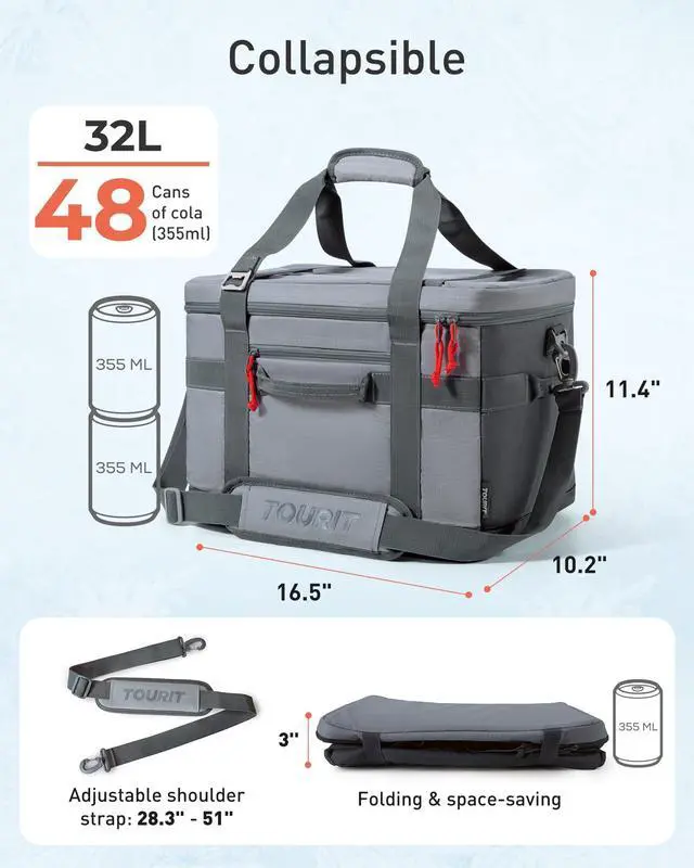 Large Capacity: Cooler bag can hold a volume of 32L (8.4 Gallons). Make you can bring 48 cans355mlof your favorite drink. Overall dimensions approximately 16 ½ x 11 ½ x 10 ¼ inch / 42 x 26 x 29 cm and weight 700g. It is perfect for beaches, camping, hiking, etc
