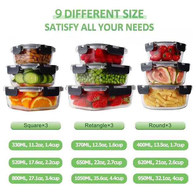 HOMBERKING 18 Pieces Glass Food Storage Container Set (9 lids & 9 containers)