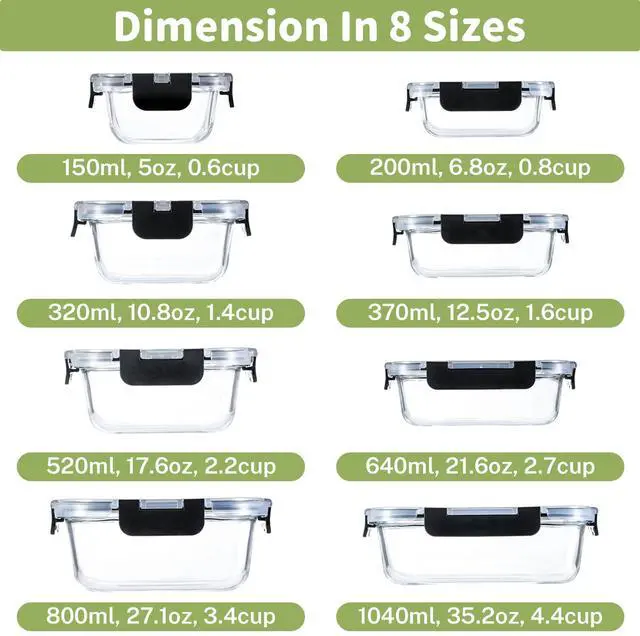 HOMBERKING 8 Packs Glass Food Storage Containers Set (8 lids & 8 containers)