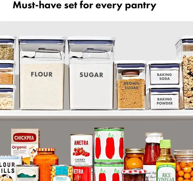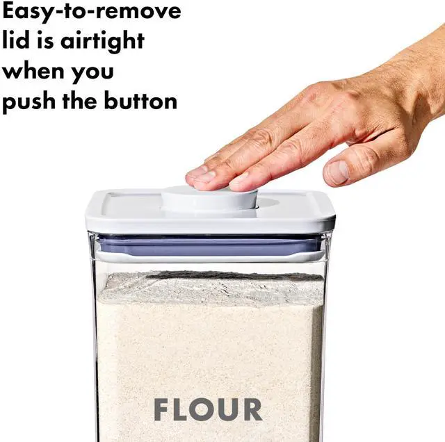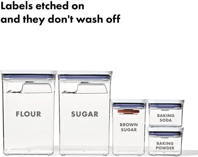 We designed the Good Grips 8-Piece POP Container Baking Set to keep everyday baking essentials fresh and pantries organized. Airtight, stackable, space-efficient, and now completely dishwasher safe, these containers can be customized to fit any space. Each container is carefully sized to fit key ingredients like 1 pound boxes of brown sugar, 5 pound bags of flour and sugar, baking soda, baking powder, chocolate chips, coconut flakes and more. Our solutions-focused POP Accessories help you make the most of POP and secure neatly to the underside of lids. The ½ Cup Scoops are perfect for measuring, and the Brown Sugar Saver keeps brown sugar soft and clump free. With a handy fill line to guide you, curved corners for smooth dispensing and sturdy, BPA-free construction, POP Containers take organizing to the next level. For best results, always use the button to open and close. Do not carry POP Containers by the lid.