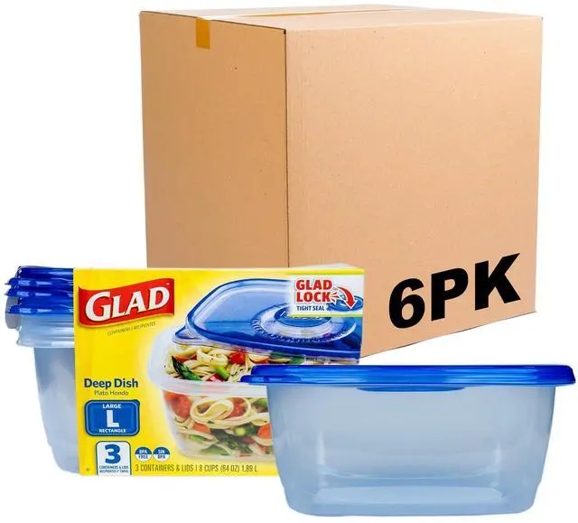 Glad GladWare Deep Dish Food Storage Containers are large 64 oz rectangle containers with a deeper profile designed to accommodate large-volume dishes that need more depth than standard shallow containers. Each container holds up to 64 ounces or 8 cups, making it well-suited for pasta dishes, large salads, casseroles, soups, and other generous portions. These containers are best used by families managing large leftover quantities, people who batch-cook and store multiple servings at once, and anyone who regularly sends leftovers home with guests after dinners and gatherings. The three-count pack supports storing several dishes simultaneously. Fill the container and press the lid down firmly until all edges click into the sealed position before moving or refrigerating. Vent one corner before microwaving. Containers are top rack dishwasher safe and freezer safe for extended storage.