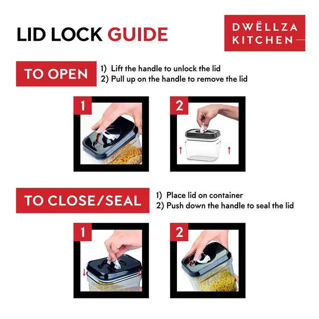 Our food storage containers create an airtight seal by simply pushing down the ring on the lid. Lift the ring and push up whenever you want to open the containers. The airtight seal is so secure you can store liquids without ever worrying about leaks!