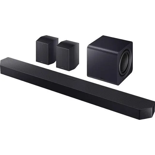 Experience our top-of-the-line 11.1. 4 soundbar, delivering breathtaking surround sound that elevates your home theater to new heights. With the included rear speakers, get an immersive audio experience that surrounds you from every angle. Feel heightened emotion with every thunderstorm, explosion, or car chase thanks to powerful, booming bass. Sit back and let the action come to life, with audio that makes every moment feel more realFeatures: True 11.1. 4 Ch Full SurroundEnjoy theater-like sound in your home with 11.1. 4 channels of fully cinematic surround sound. 11 front & surround channels, 1 subwoofer channel, and 4 up-firing channels envelop you in sound. The compact 8-inch dual active unit subwoofer delivers powerful bass with AI-based control technology that optimizes bass. With wireless up-firing rear speakers included, sound wraps around and from above by reflecting sound off the ceiling to deliver breathtaking overhead audio. Wireless Dolby AtmosSurround yourself in legendary Dolby Atmos™ 3D sound — with or without an HDMI cable. The object-based spatial audio lets you hear every distinct sound from above and around you. Whether it's the sound of helicopters flying in the sky, cars whizzing by, or an orchestra in a concert hall washing over you, feel fully immersed in your content just like in the movies. Q-SymphonyProvides a more immersive sound experience with Samsung TV and Soundbar speakers working together for more robust and nuanced sound. With compatible AI TVs, it separates voices and background sounds from the original audio input and remasters audio objects to deliver optimal surround soundSpaceFit Sound Pro PlusEnjoy stunning sound automatically tuned and calibrated to your room using sensors embedded into the soundbar.