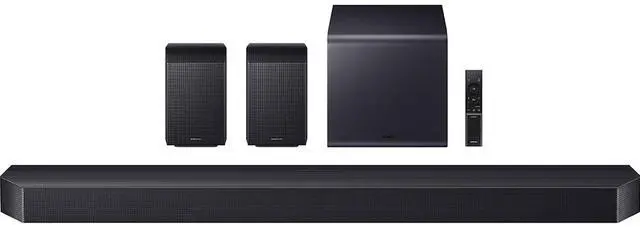 Experience our top-of-the-line 11.1. 4 soundbar, delivering breathtaking surround sound that elevates your home theater to new heights. With the included rear speakers, get an immersive audio experience that surrounds you from every angle. Feel heightened emotion with every thunderstorm, explosion, or car chase thanks to powerful, booming bass. Sit back and let the action come to life, with audio that makes every moment feel more realFeatures: True 11.1. 4 Ch Full SurroundEnjoy theater-like sound in your home with 11.1. 4 channels of fully cinematic surround sound. 11 front & surround channels, 1 subwoofer channel, and 4 up-firing channels envelop you in sound. The compact 8-inch dual active unit subwoofer delivers powerful bass with AI-based control technology that optimizes bass. With wireless up-firing rear speakers included, sound wraps around and from above by reflecting sound off the ceiling to deliver breathtaking overhead audio. Wireless Dolby AtmosSurround yourself in legendary Dolby Atmos™ 3D sound — with or without an HDMI cable. The object-based spatial audio lets you hear every distinct sound from above and around you. Whether it's the sound of helicopters flying in the sky, cars whizzing by, or an orchestra in a concert hall washing over you, feel fully immersed in your content just like in the movies. Q-SymphonyProvides a more immersive sound experience with Samsung TV and Soundbar speakers working together for more robust and nuanced sound. With compatible AI TVs, it separates voices and background sounds from the original audio input and remasters audio objects to deliver optimal surround soundSpaceFit Sound Pro PlusEnjoy stunning sound automatically tuned and calibrated to your room using sensors embedded into the soundbar.