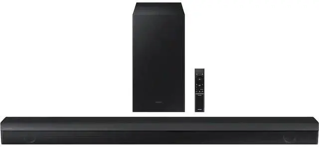 Enhance your home audio experience with the Samsung HW-B650/ZA 3.1 soundbar and wireless subwoofer combo. Featuring a total output power of 430W, Bluetooth connectivity, and a sleek black design. The soundbar is wall mountable and includes a remote control for easy operation.