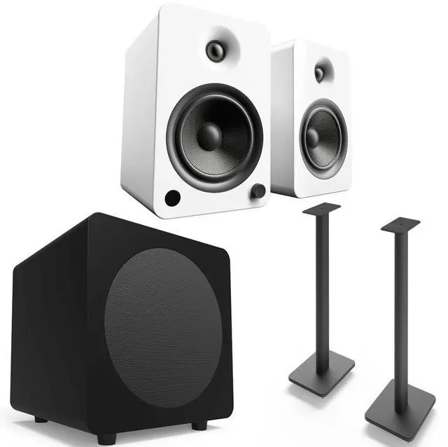 Kanto YU6MW YU6 Matte White 200 W Speakers (Pair), SP32PL Pair of 32" Speaker Stands, Black & SUB8 8" 250W Sub - Black - This bundle includes Kanto YU6MW YU6 Matte White 200 Watt Peak Powered Speakers with Bluetooth, Built-In Phono Preamp and Kevlar® Drivers, Pair, Kanto SUB8MB SUB8 Onyx 8-Inch 250-Watt Powered Subwoofer - Matte Black - with RCA cable, Kanto SP32PL 32" Floor Speaker Stands with Security Mounting Screws, Pair, Black, and a Creative Audio coozy.