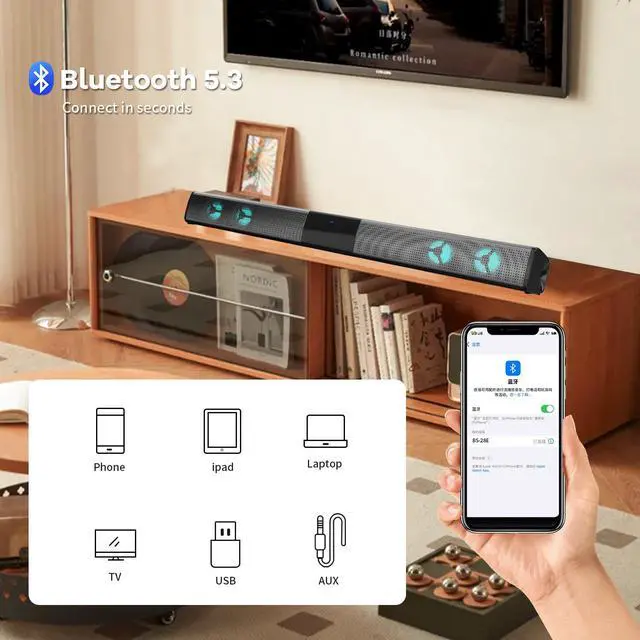 Wireless Soundbar brings you elegant and simple sense of sight. 21.6 inch ultra-slim Sound Bars fits all size of Home TV. Delivering immersive room-filling sound.