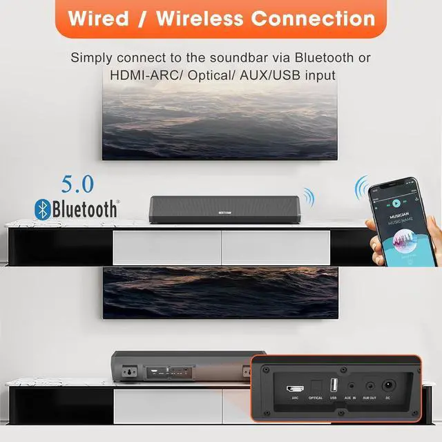 Distingue other small soundbars, we add HDMI connection, you can enjoy HDMI ARC and Optical inputs to send the highest-quality audio from your TV. Wireless 5.0 Bluetooth-embedded sound bar, you can stream your favorite music on the indoor/patio/home gym so easily and enjoy wireless stream audio from your phone, tablet, PC, or projector quickly; Also support AUX and USB connection and SUB out for connect with extra subwoofer to add more bass.