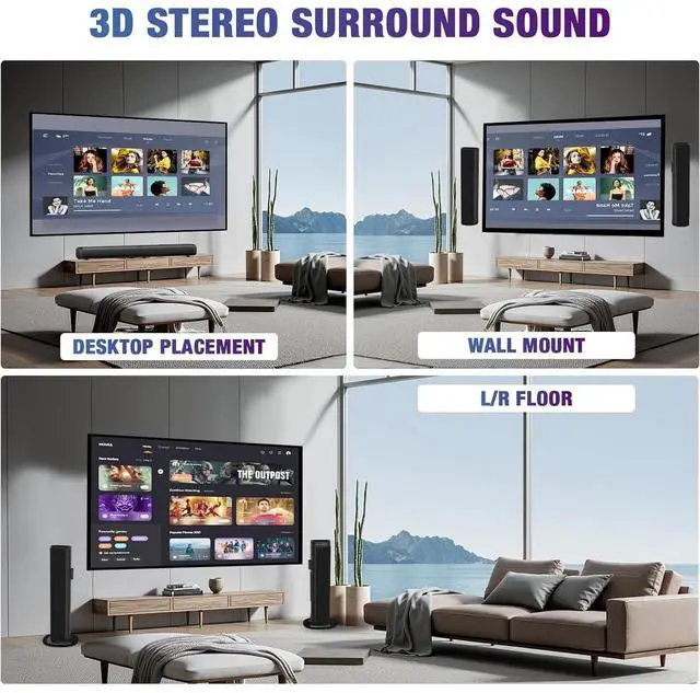 Personalized Audio ModesThis soundbar offers three EQ modes (Music/Movie/Game) to optimize your listening experience. Advanced 3D surround sound technology enriches explosive effects, sound details, and crisp dialogue. Whether watching movies, enjoying live concerts, following sports, or catching up on the news, this home theater sound system delivers enhanced depth and clarity for all your favorite content