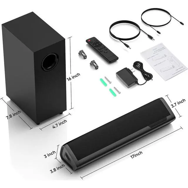 What's You Get! The package contains the following products:Soundbar*1, subwoofer*1, remote control*1, user manual*1, 3.5mm to 3.5mm auxiliary cable*1, optical cable*1, brackets*2 expanded plastic pipe*2 and screws*2.