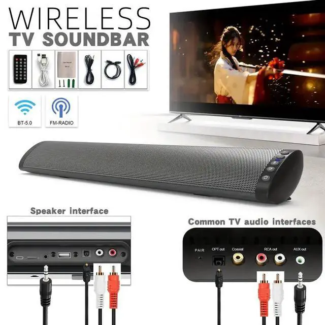 Upgrade your home or outdoor audio with this Wireless Bluetooth TV Soundbar. Featuring 20W powerful sound, Bluetooth 5.0, built-in battery, and IPX4 waterproof design, it's perfect for TV, computer, desktop, living room, and portable use.