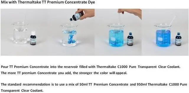 The latest C1000 Pure Clear Coolant launched by Thermaltake is utilized either as a transparent coolant or to mix with TT Premium Concentrate Series to customize the coolant color users desire. This high performance new member is made in Germany, virtually odorless and non-flammable, plus it features anti-corrosion protection and heat-transfer medium for PC water-cooling and superb protection for copper, nickel, brass, and aluminum. Create your own coolant color and experience the excitement of color mix & match.