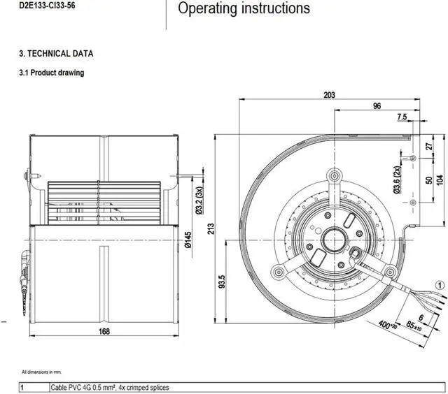 Product Parameter: Model.D2E133-CI33-56 Motor:M2E068-CF Type:Forward Leaning Centrifugal Fan Brand ebm-papst Nominal voltage:230VAC Frequency : 50/60Hz Valid for approval/standard:CE Speed:1700/2100RPM Power consumption:175/190W Current draw: 0.77A/0.84A Capacitor voltage: 400VDB Weight:3.3kg Size:133mm Motor Size:68 Impeller material:Sheet steel, galvanized Housing material:Sheet steel, galvanized Degree of protection:IP44 Insulation class:B Approval:EAC,CCC; Motor bearing:Ball bearing Package: Fan*1Product informationPackage Dimensions39.37 x 39.37 x 19.69 inchesItem Weight0.01 ouncesManufacturerebmpapstASINB07Q6JKV5MBest Sellers Rank#11,496 in Computer Case FansDate First AvailableMarch 29, 2019Warranty & SupportProduct Warranty: For warranty information about this product, please click here FeedbackWould you like to tell us about a lower price?