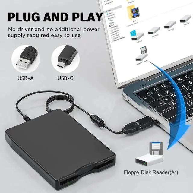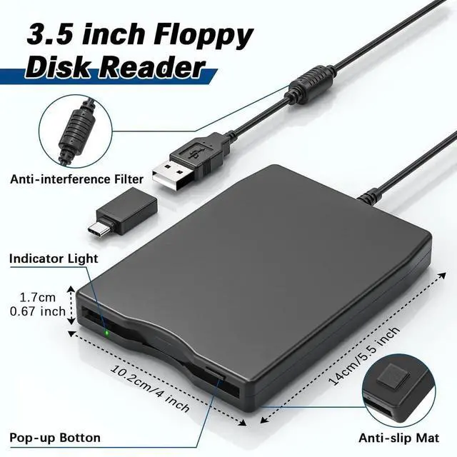 USB Floppy Disk Reader: USB external floppy disk drive reads 3.5 inch floppy discs with a capacity of 720KB/ 1.44 mb. The USB-A port and additional Type-C adapter are compatible with most laptops and desktop computers. Floppy disk reader is an excellent solution to reading and writing your old floppy disks.