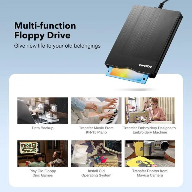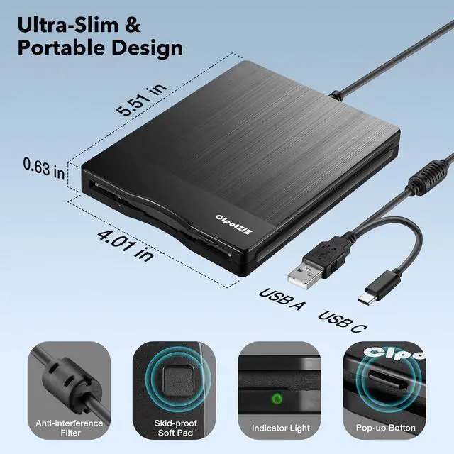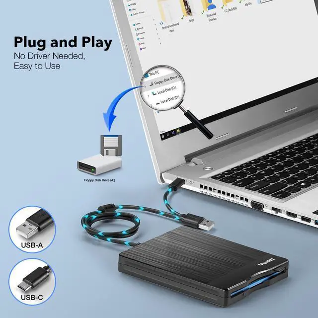 This external floppy disk drive is compatible with 3.5inch floppy disks and is specially designed to meet your needs to access and read floppy disk data. Its simple and user-friendly design allows you to easily insert and remove floppy disks, without the need for complicated installations or drivers