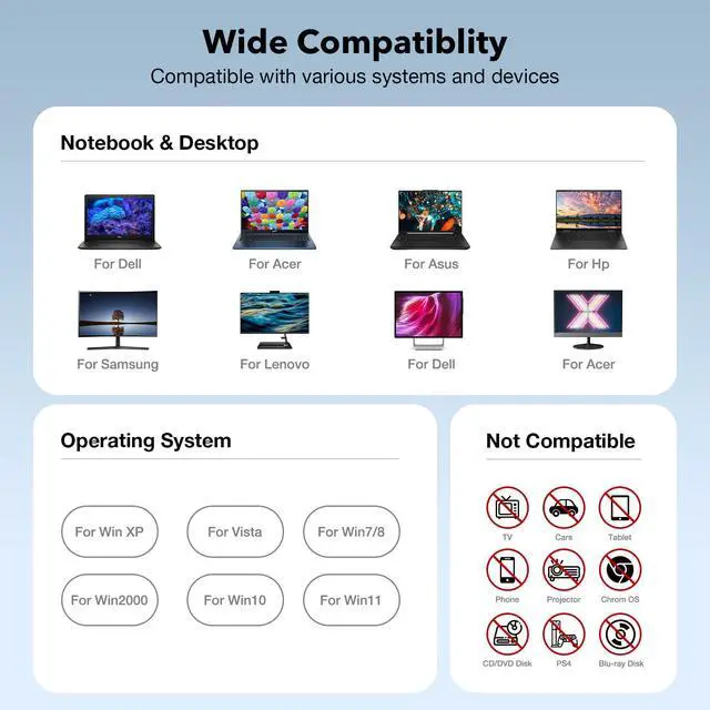 | Compatible Systems | Compatible with windows 11/ 10/ 8.1/ 7/ Vista/ XP OS, Special Tips: NOT compatible with MAC operating system. |