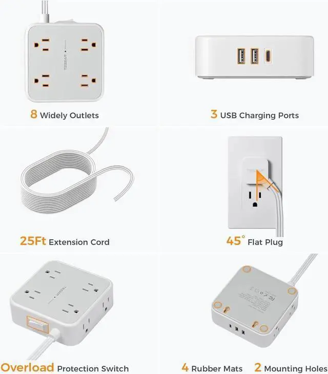 11 in 1 Office Charging Station: TESSAN flat plug extension cord expand 1 socket to 8 outlets and 3 USB ports, charging 11 devices at the same time. With 1.9 in widely space in between, can fit 8 big plugs together without blocking, saving your home and office space