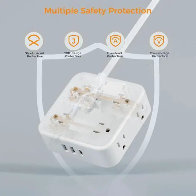 Surge Protector Power Strip 900J: Equipped with overload protection, short-circuit protection, over-current protection, and etc; The on/ off switch can automatically shut off to protect your expensive computers, tv, or other electronics, providing a safe and reliable charging environment
