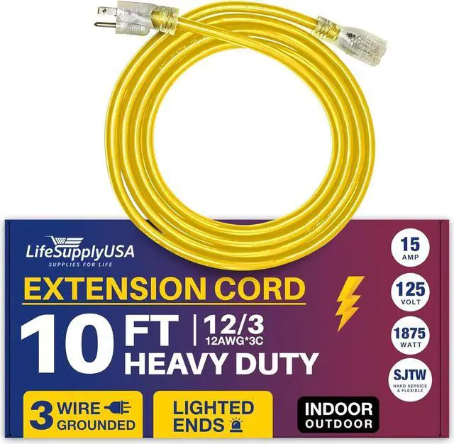 POWERFUL: This 10FT, 12 Gauge 3-prong SJTW, Yellow extension cord is designed for extra safety and durability, The cable extension electrical cord supports 15 AMP, 125 Volts, and up to 1875 Watts, ensuring robust performance for high-demand equipment, this 1 Pack embodies reliability, quality, and the grounded power to handle your most challenging projects with ease.