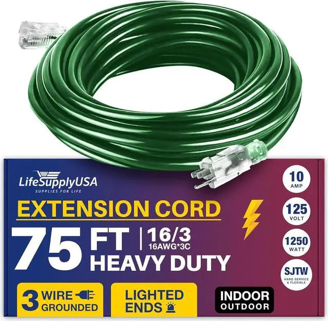 POWERFUL: This 75FT, 16 Gauge 3-prong SJTW, Green extension cord is designed for extra safety and durability, The cable extension electrical cord supports 10 AMP, 125 Volts, and up to 1250 Watts, ensuring robust performance for high-demand equipment, this 1 Pack embodies reliability, quality, and the grounded power to handle your most challenging projects with ease.