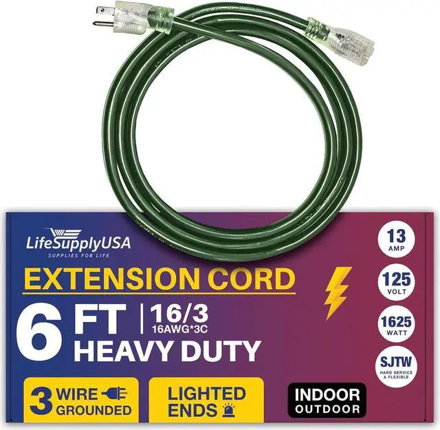 POWERFUL: This 6FT, 16 Gauge 3-prong SJTW, Green extension cord is designed for extra safety and durability, The cable extension electrical cord supports 13 AMP, 125 Volts, and up to 1625 Watts, ensuring robust performance for high-demand equipment, this 1 Pack embodies reliability, quality, and the grounded power to handle your most challenging projects with ease.