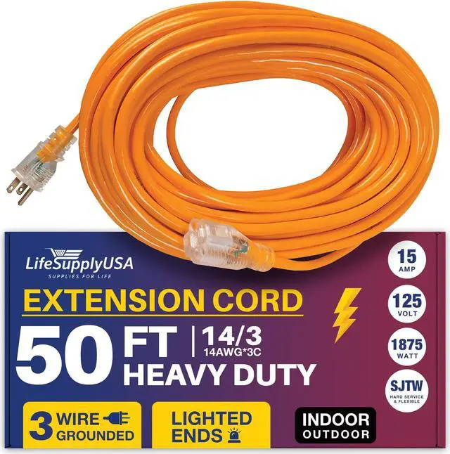 POWERFUL: This 50FT, 14 Gauge 3-prong SJTW, Orange extension cord is designed for extra safety and durability, The cable extension electrical cord supports 15 AMP, 125 Volts, and up to 1875 Watts, ensuring robust performance for high-demand equipment, this 1 Pack embodies reliability, quality, and the grounded power to handle your most challenging projects with ease.