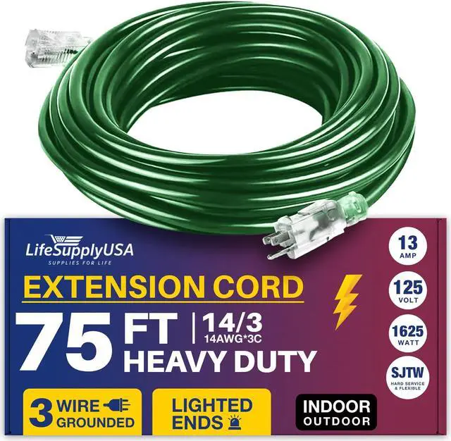 POWERFUL: This 75FT, 14 Gauge 3-prong SJTW, Green extension cord is designed for extra safety and durability, The cable extension electrical cord supports 13 AMP, 125 Volts, and up to 1625 Watts, ensuring robust performance for high-demand equipment, this 1 Pack embodies reliability, quality, and the grounded power to handle your most challenging projects with ease.