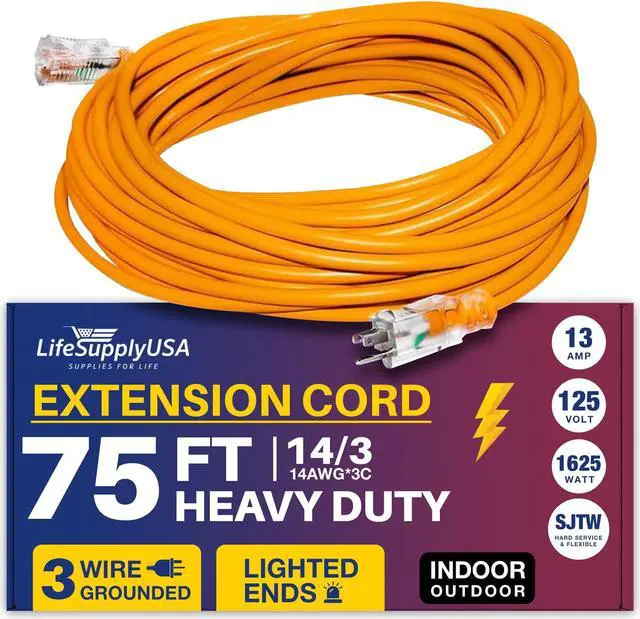 POWERFUL: This 75FT, 14 Gauge 3-prong SJTW, Orange extension cord is designed for extra safety and durability, The cable extension electrical cord supports 13 AMP, 125 Volts, and up to 1625 Watts, ensuring robust performance for high-demand equipment, this 1 Pack embodies reliability, quality, and the grounded power to handle your most challenging projects with ease.