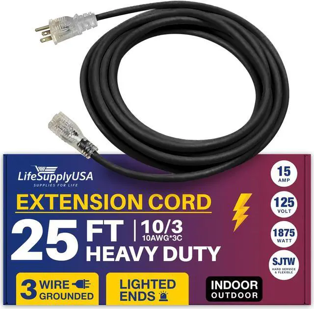 POWERFUL: This 25FT, 10 Gauge 3-prong SJTW, Black extension cord is designed for extra safety and durability, The cable extension electrical cord supports 15 AMP, 125 Volts, and up to 1875 Watts, ensuring robust performance for high-demand equipment, this 1 Pack embodies reliability, quality, and the grounded power to handle your most challenging projects with ease.