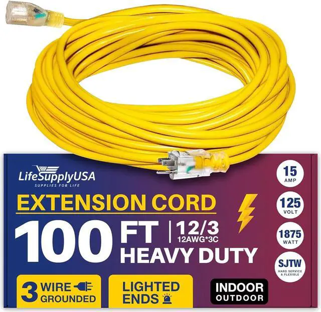 POWERFUL: This 100FT, 12 Gauge 3-prong SJTW, Yellow extension cord is designed for extra safety and durability, The cable extension electrical cord supports 15 AMP, 125 Volts, and up to 1875 Watts, ensuring robust performance for high-demand equipment, this 1 Pack embodies reliability, quality, and the grounded power to handle your most challenging projects with ease.