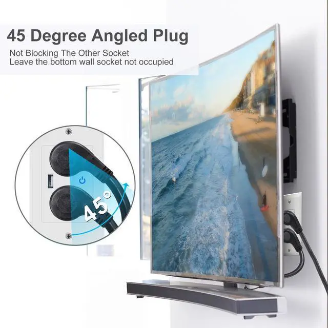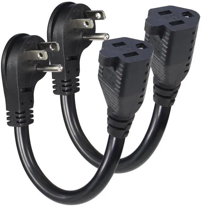 Low Profile Flat Plug NEMA 5-15P45-Degree angled flat head plug power cord extension, perfect solution for behind furniture or a desk close to the wall outlet. Right angle 3 Pin AC power cord plug extends only 0.58 inch from the receptacle; Non-blocking design directs the cord to the right of the receptacle, extends the cord to the right to avoid blocking the bottom AC outlet.